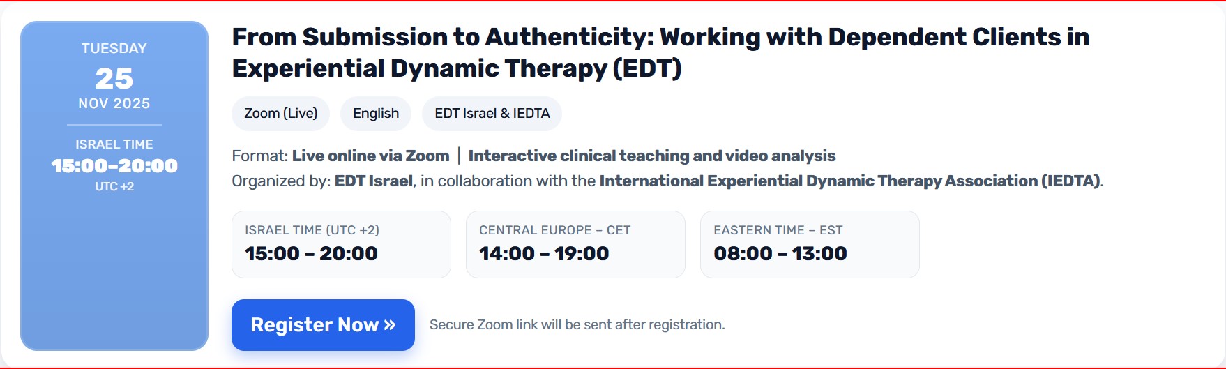 This five-hour clinical workshop integrates theory, live teaching, video-based demonstrations, and experiential practice. Participants will deepen their understanding of dependent dynamics and explore how to translate EDT principles into moment-to-moment therapeutic action.